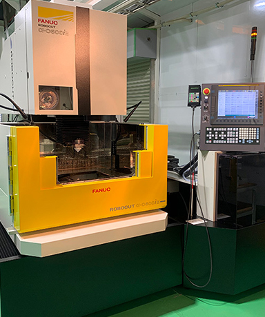 特徴:ワイヤーカット放電加工機 最大加工サイズ600×400×410切削加工で対応できない、形状や硬度が高い物などを加工しています。又カップリングなどの内径キー溝加工も対応しています。